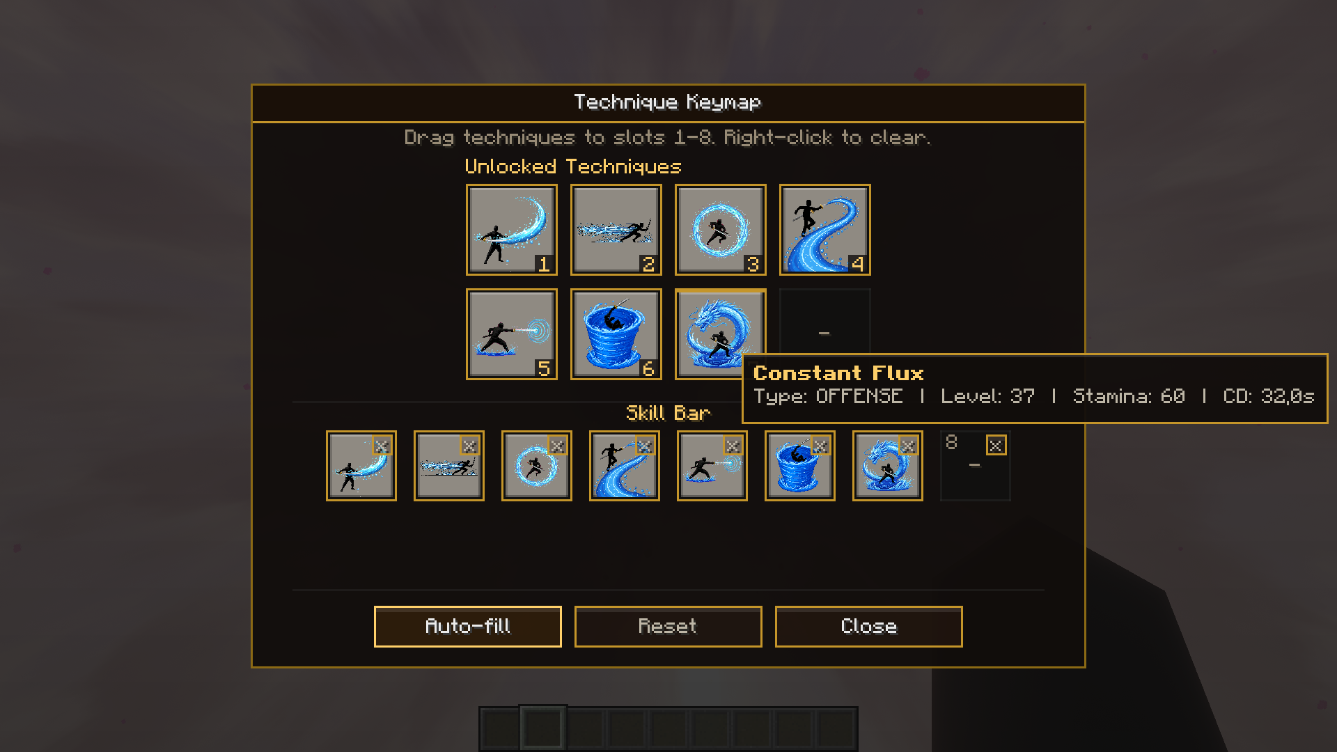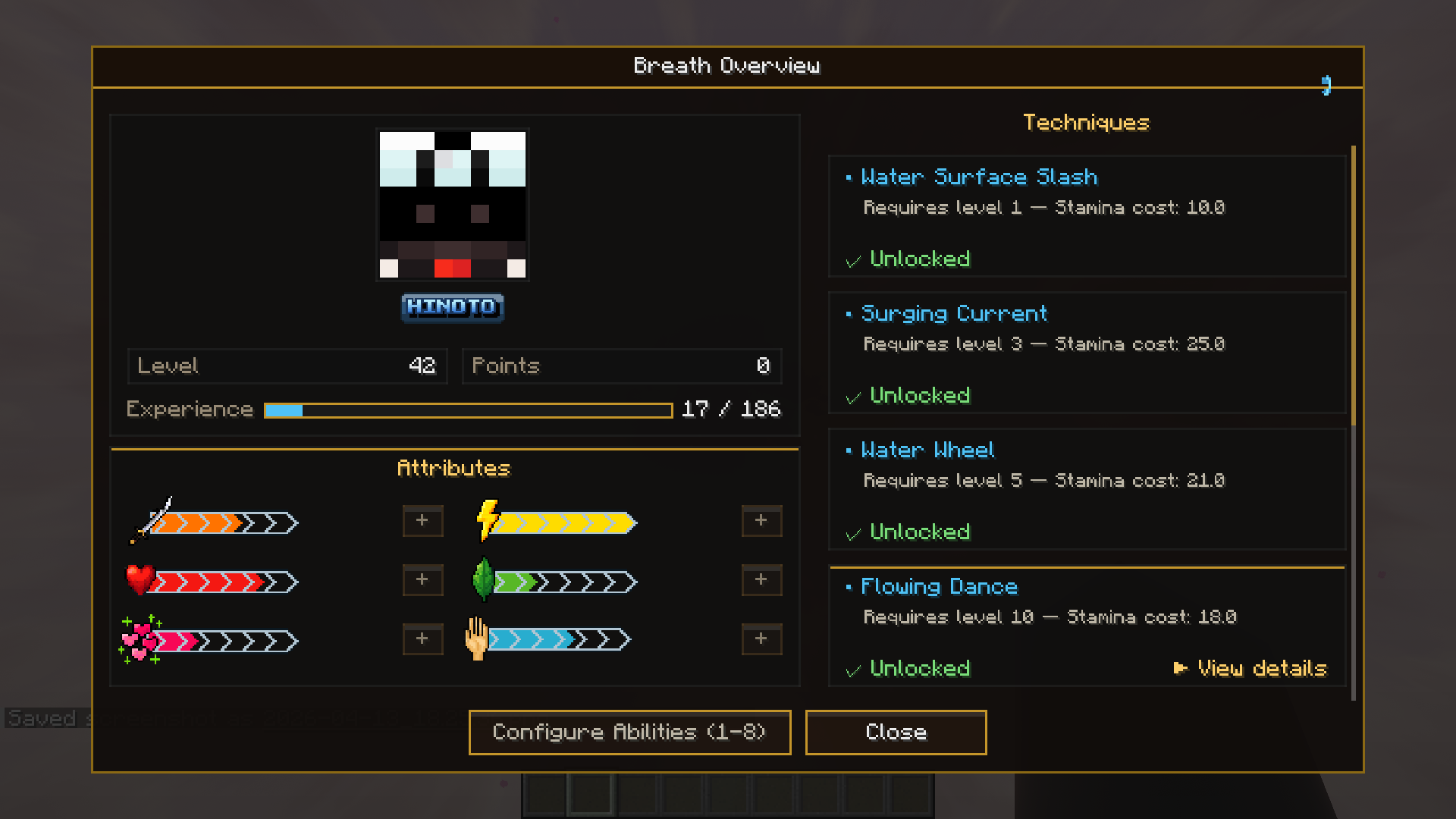 To use a technique you need a Nichirin Sword in your main hand, an active breathing style, enough stamina, and the required player level.