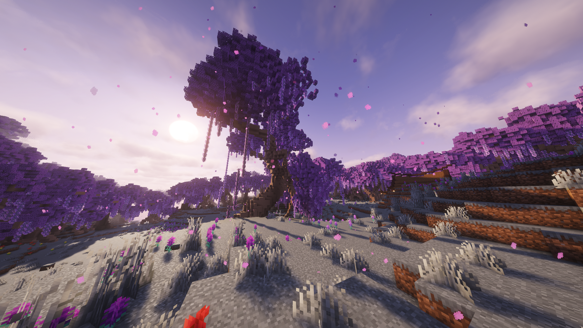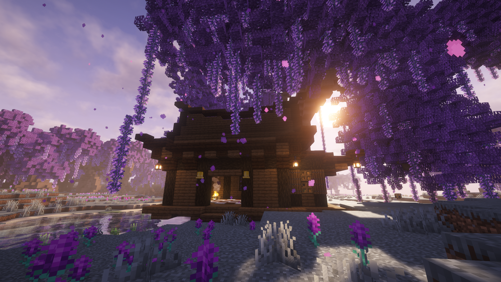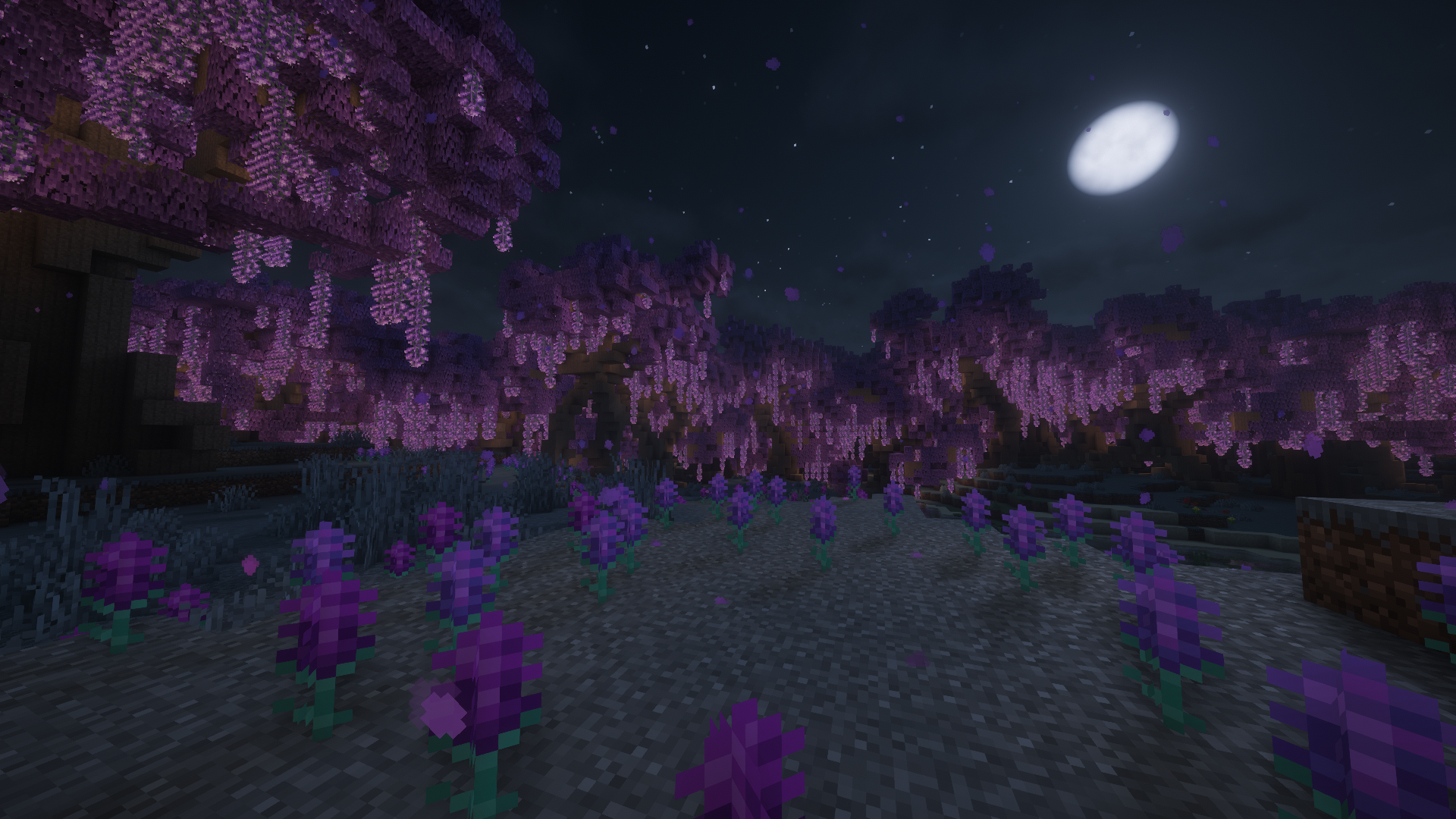 Wisteria flowers grow as ground patches in both biomes, appearing in indigo and purple varieties. You can harvest them with shears for decoration.